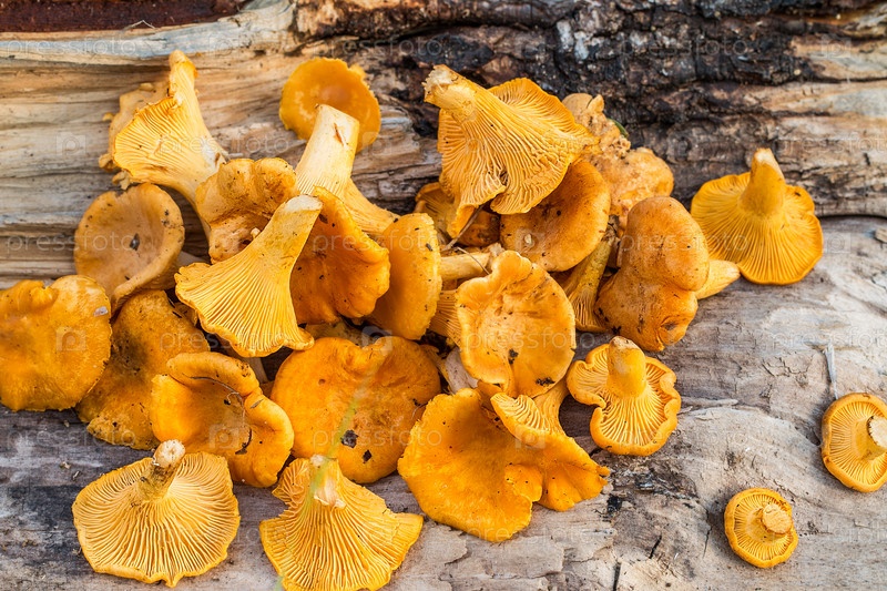 Грибы лисички на деревянном фоне