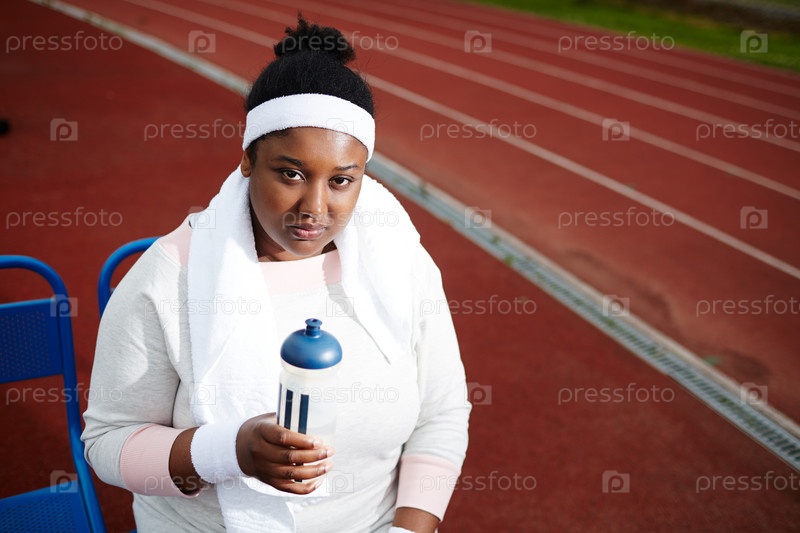 Афро-американская женщина отдыхает и пьет воду после бега на дорожке