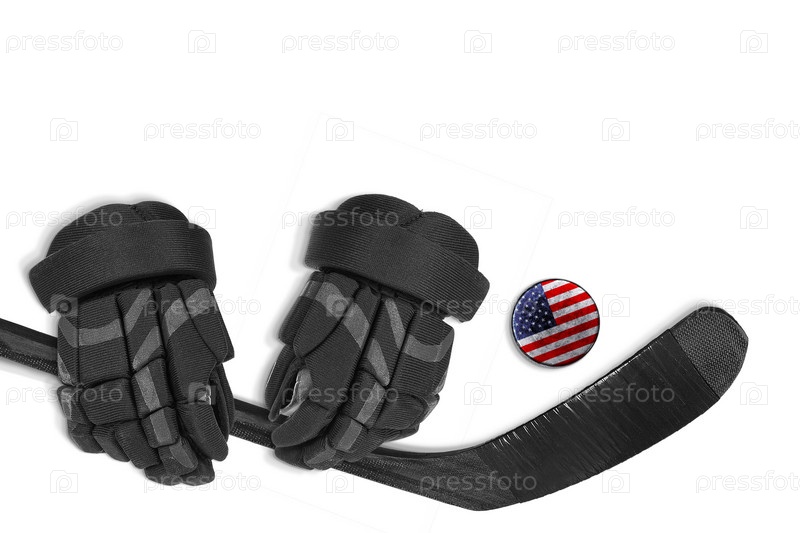 Американская шайба, перчатки и хоккейная клюшка