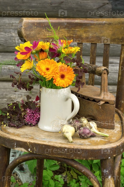 Цветы, лук и утюг на старом стуле