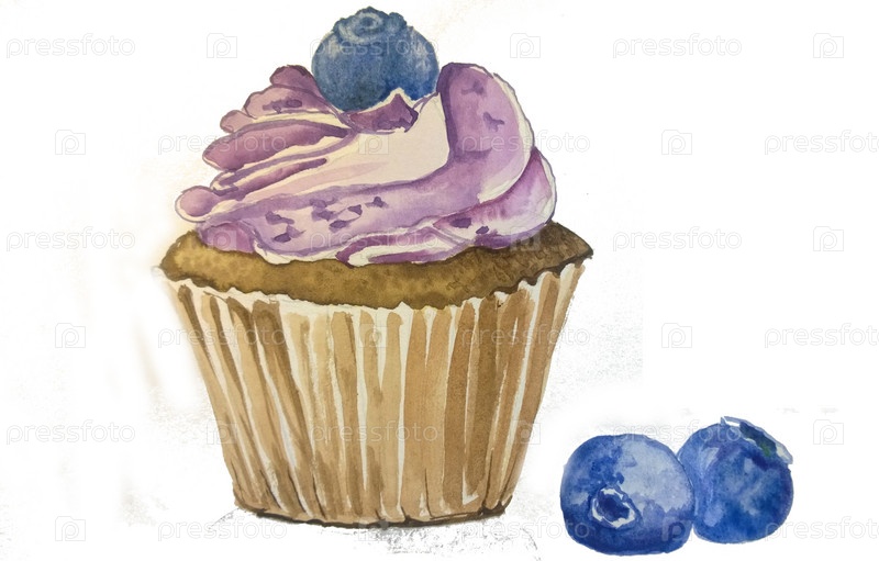 Кекс с кремом и черникой, акварельная иллюстрация