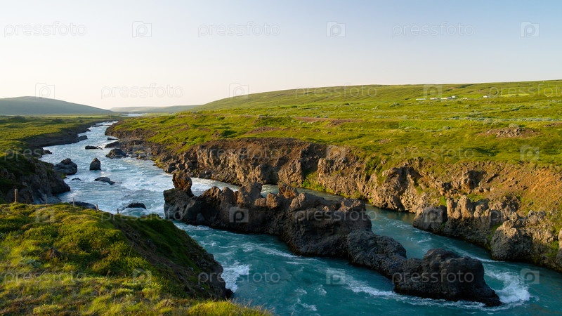 Река Скьяульвандафльоут с каменным островом, Исландия