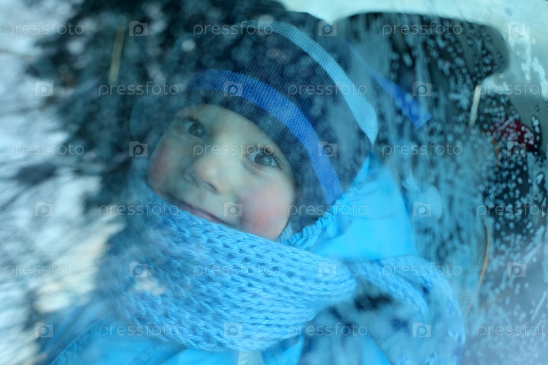 Портрет мальчика сквозь замерзшее автомобильное стекло