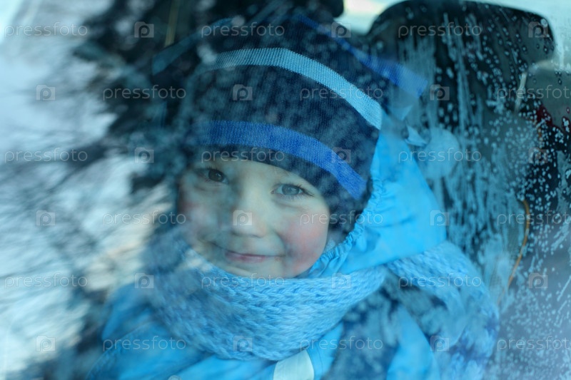 Портрет мальчика сквозь замерзшее автомобильное стекло