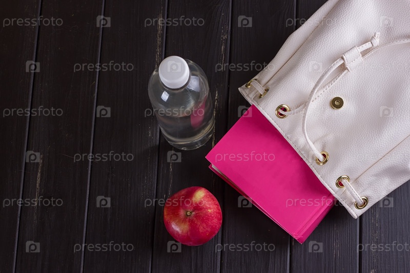 Белый кожаный рюкзак, розовая книга, бутылка воды