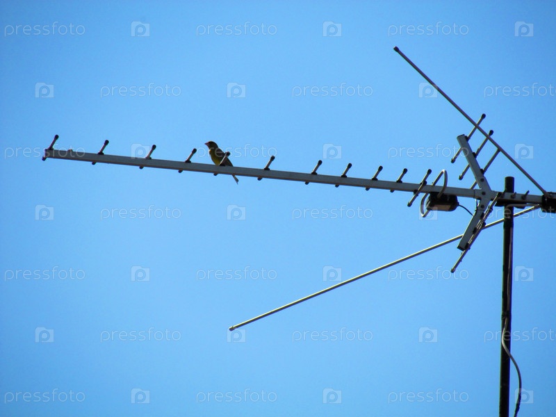 Воробей на антенне на фоне ясного голубого неба