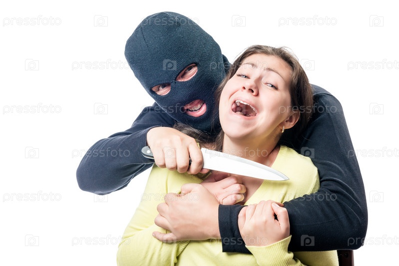 Преступник в балаклаве угрожает жертве ножом