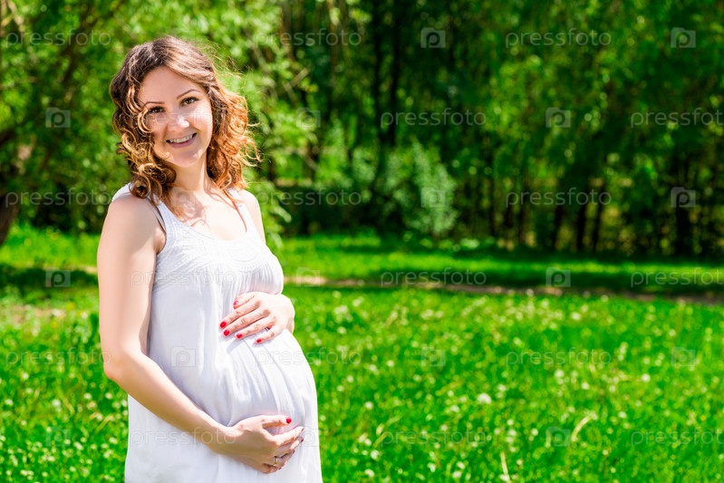 Портрет счастливой будущей матери в зеленом парке
