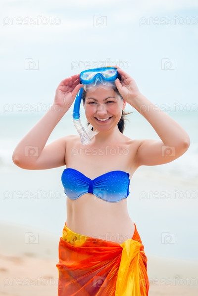 Портрет женщины в бикини с маской для дайвинга на фоне моря