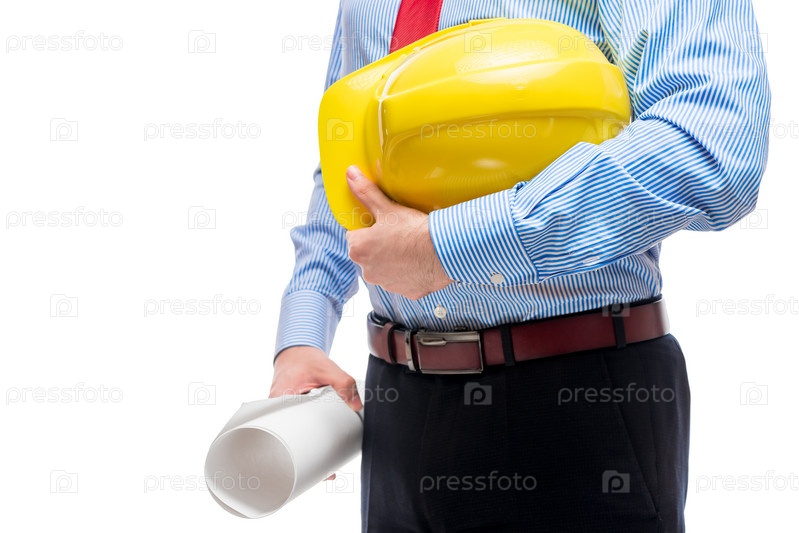 Руки архитектора со шлемом и чертежами на белом фоне