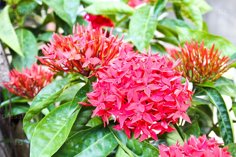 Красный цветок иксора в саду