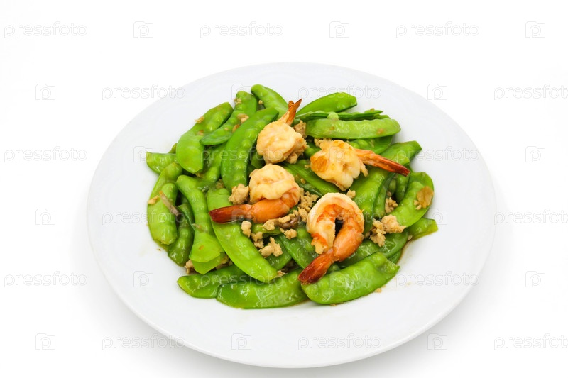 Обжаренный горох с креветками на тарелке