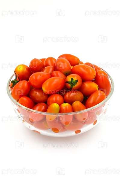 Томаты черри в стеклянной миске на белом фоне