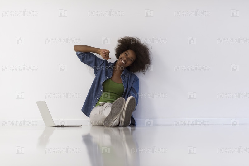 Афро-американская женщина, сидя на полу с ноутбуком