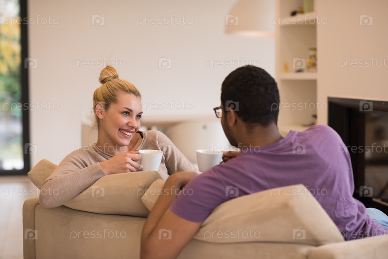 Молодая многонациональная пара перед камином
