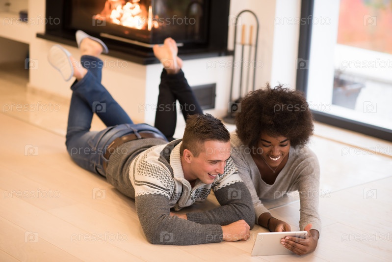 Многонациональная пара использует планшетный компьютер на полу
