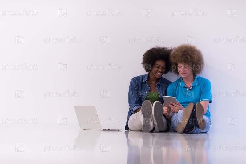 Многонациональная пара сидит на полу с ноутбуком и планшетом