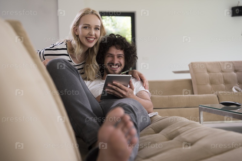 Пара отдыхает дом с планшетными компьютерами