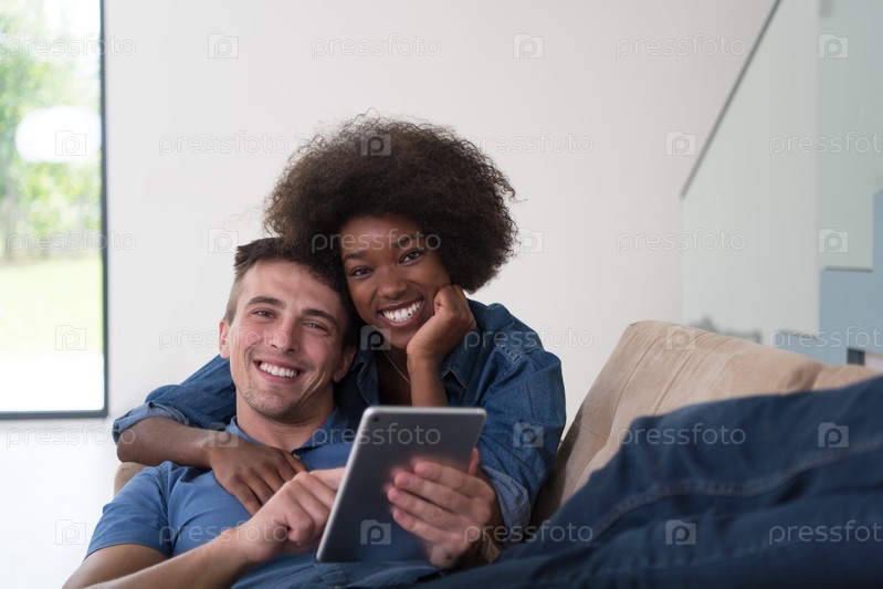 Многонациональная пара отдыхает дом с планшетными компьютерами