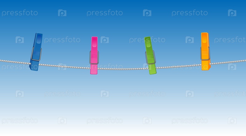Веревка с разноцветными прищепками на фоне синего неба