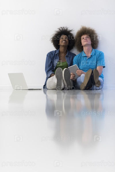 Многонациональная пара сидит на полу с ноутбуком и планшетом