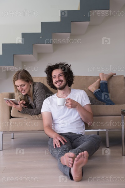Пара отдыхает дом с планшетными компьютерами