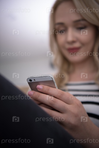 Женщина, сидя на диване с мобильным телефоном