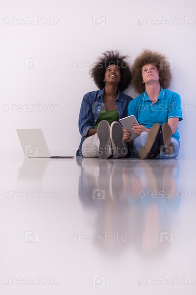 Многонациональная пара сидит на полу с ноутбуком и планшетом