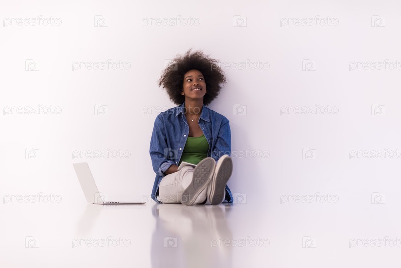 Афро-американская женщина, сидя на полу с ноутбуком