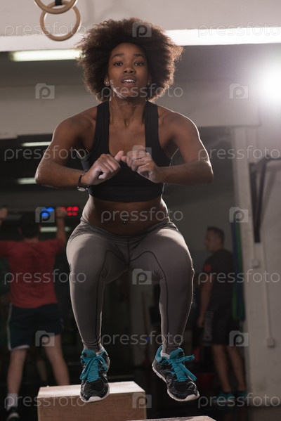 Черная женщина прыгает в тренажерном зале