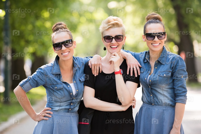 Портрет трех молодых женщин в темных очках