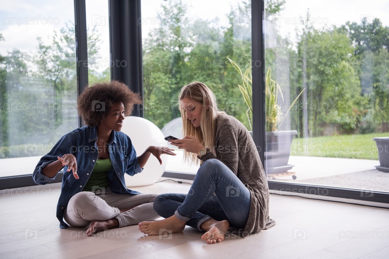 Многонациональные женщины сидят на полу с кофе