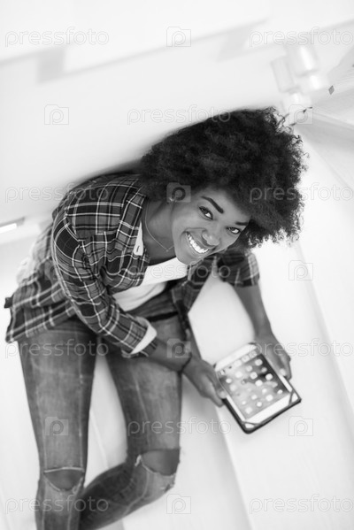 Черная женщина, используя свой электронный планшет