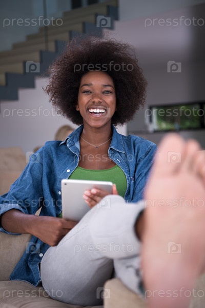Афро-американская женщина в доме с цифровым планшетом