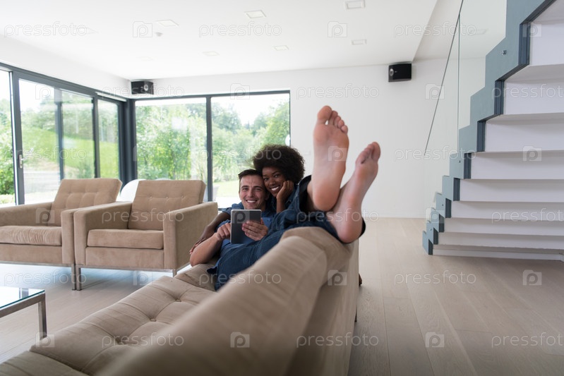 Пара отдыхает дом с планшетными компьютерами