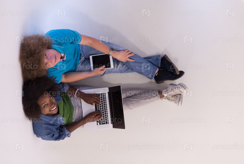 Многонациональная пара сидит на полу с гаджетами