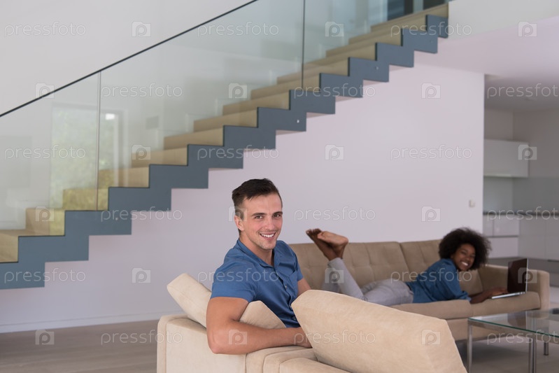 Молодая многонациональная пара отдыхает в гостиной