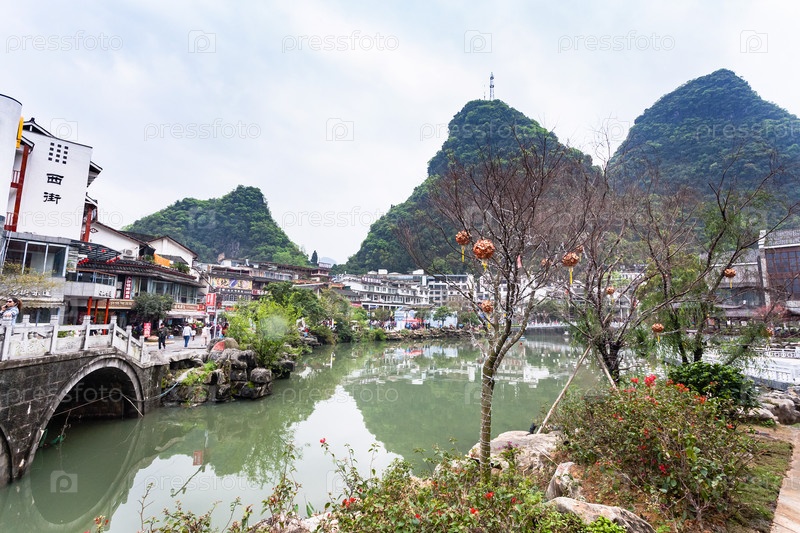 Дерево с фонарями и мостом в городе Яншо