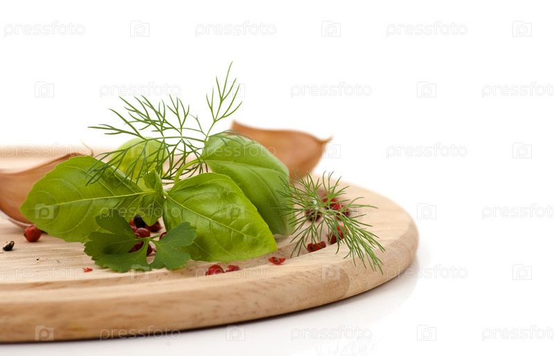 Базилик, укроп и петрушка на деревянной доске