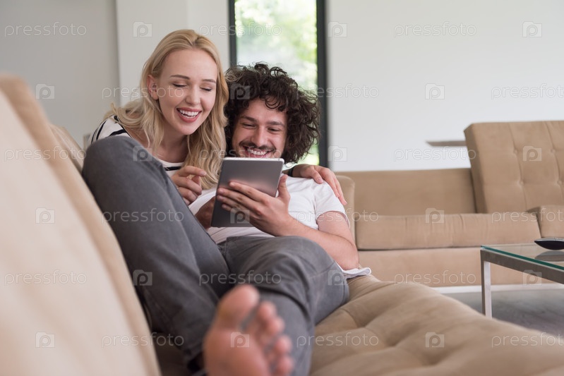 Пара отдыхает дом с планшетными компьютерами