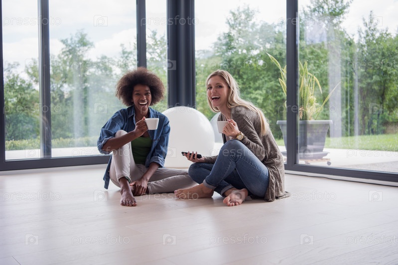 Многонациональные женщины сидят на полу с кофе