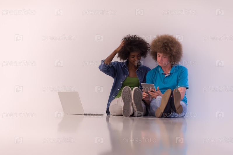 Многонациональная пара сидит на полу с ноутбуком и планшетом