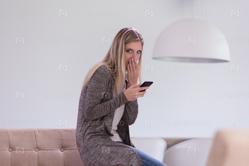 Женщина, сидя на диване с мобильным телефоном