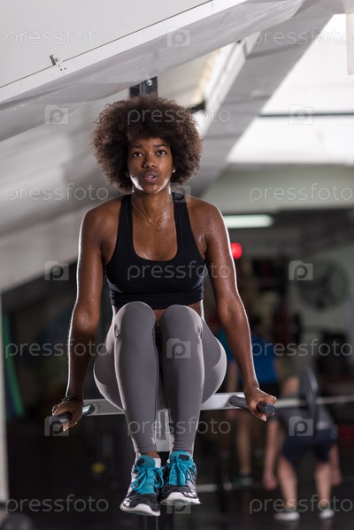 Черная женщина делает упражнения на брусьях