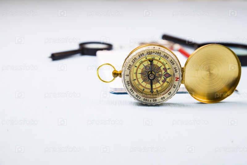 Компас, увеличительное стекло и блокнот
