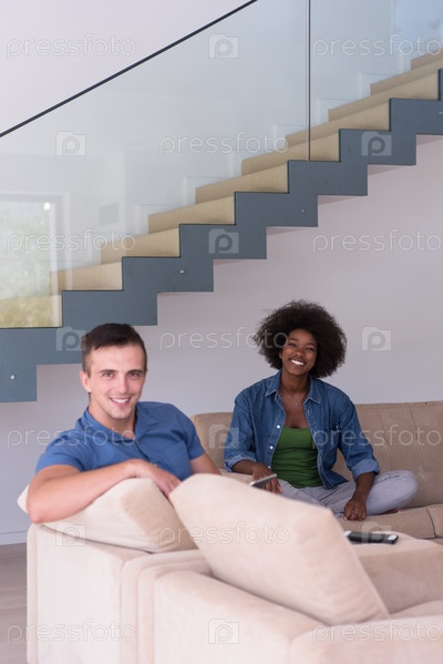Многонациональная пара отдыхает дома с планшетными компьютерами