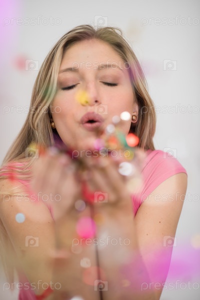 Женщина дует конфетти в воздух