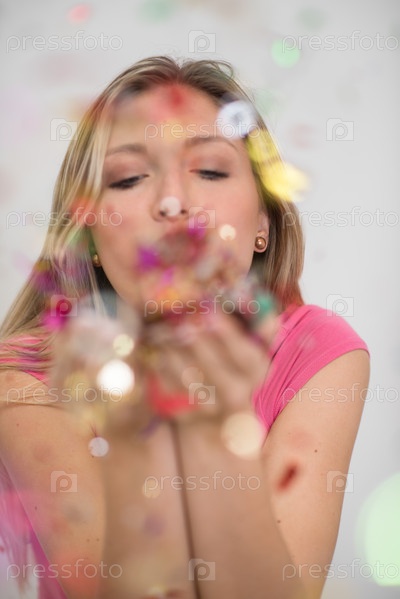 Женщина дует конфетти в воздух