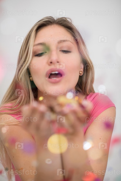Женщина дует конфетти в воздух