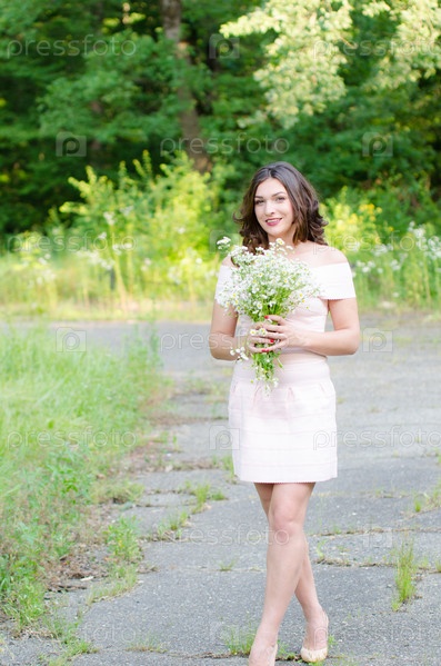 Портрет красивой молодой девушки с букетом цветов